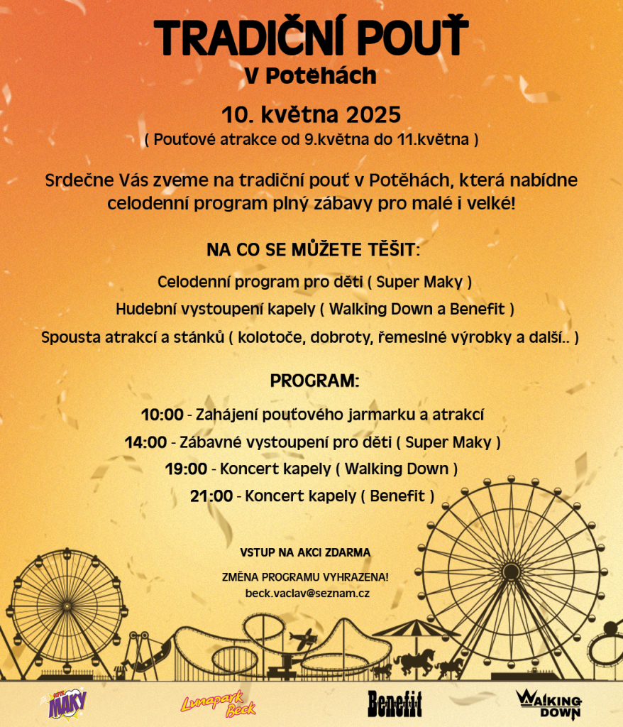 Zveme vás na tradiční pouť v Potěhách, která se uskuteční od 10. do 11. května. V sobotu na vás čeká celodenní program plný zábavy, hudby a atrakcí pro všechny věkové kategorie.